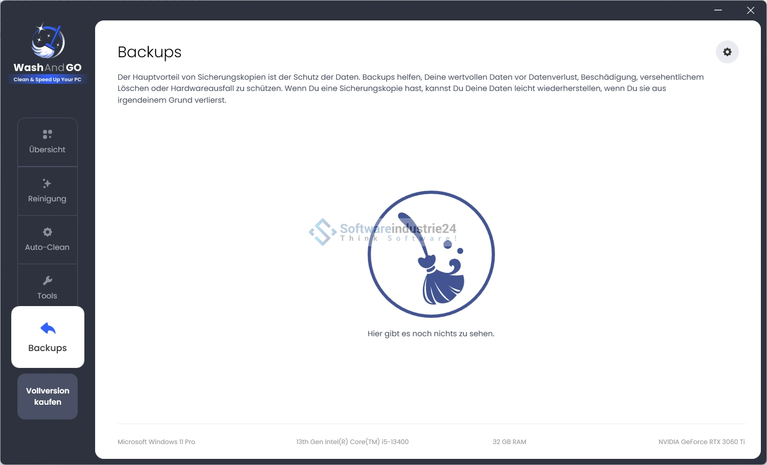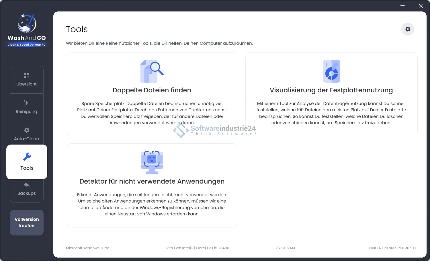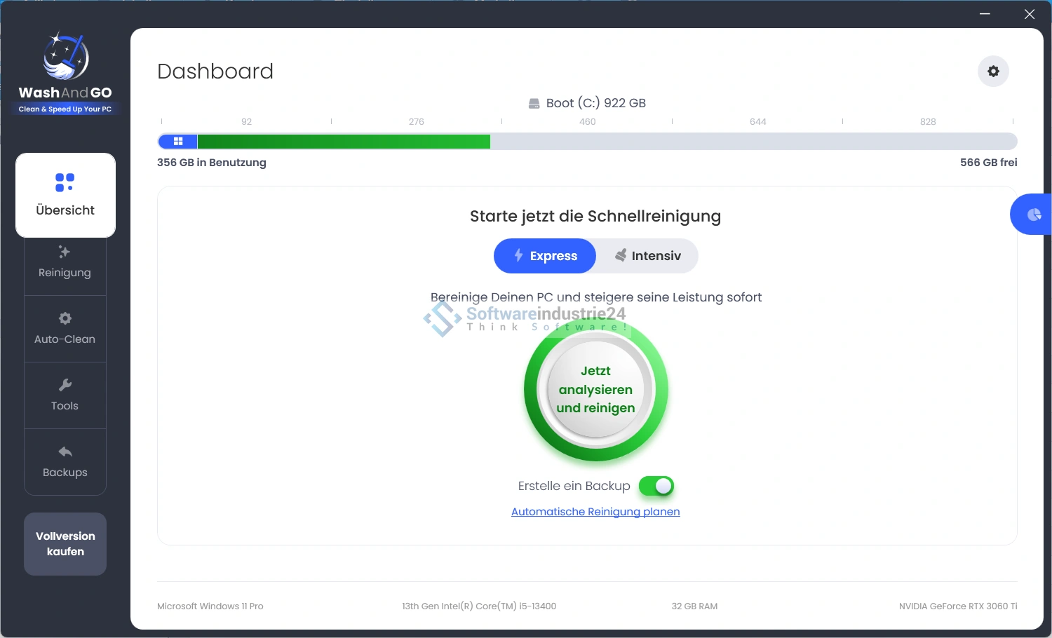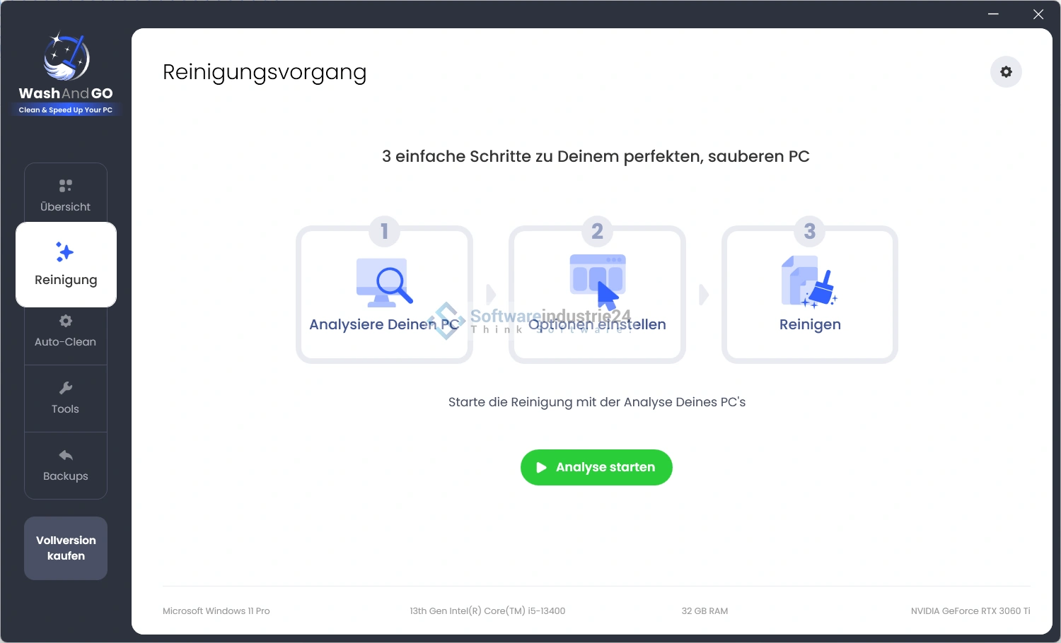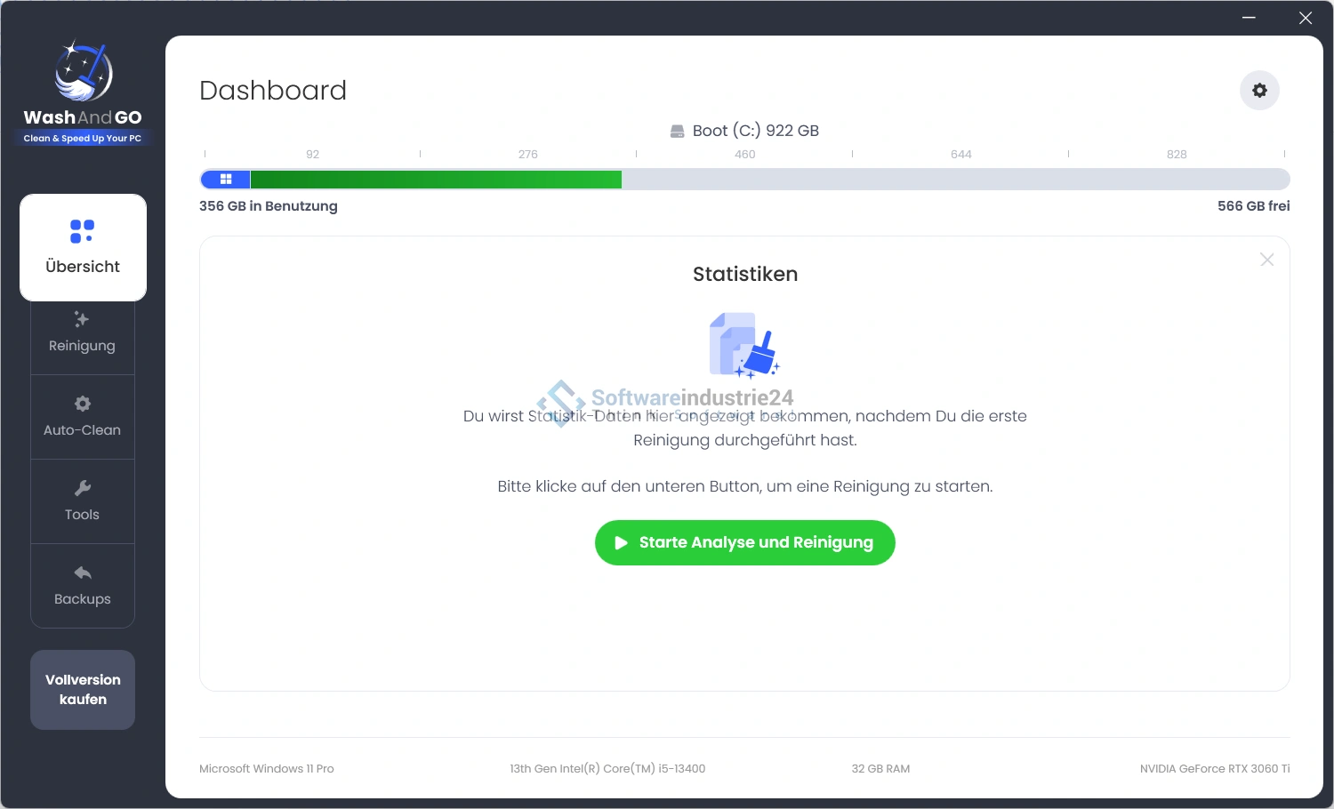 - Tiefenreinigung: WashAndGo scannt Ihr System nach unnötigen Daten, temporären Dateien und Registry-Einträgen.