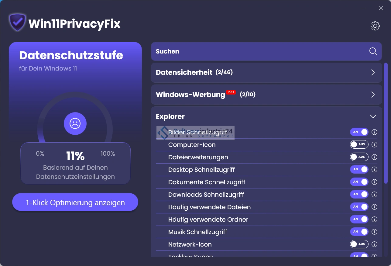 - Optimierung: Mit einem Klick passen Sie alle Einstellungen an und schützen Ihre Privatsphäre.