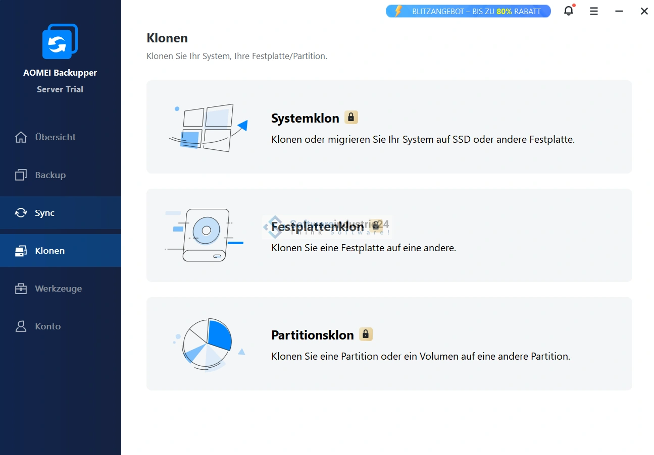 Mit AOMEI Backupper Server Edition können Sie Ihre Festplatte oder Ihr System auf eine andere Festplatte klonen. Diese Funktion ist besonders nützlich, wenn Sie Ihre Festplatte auf eine neue Festplatte upgraden oder Ihre Daten auf einen anderen Server migrieren möchten.