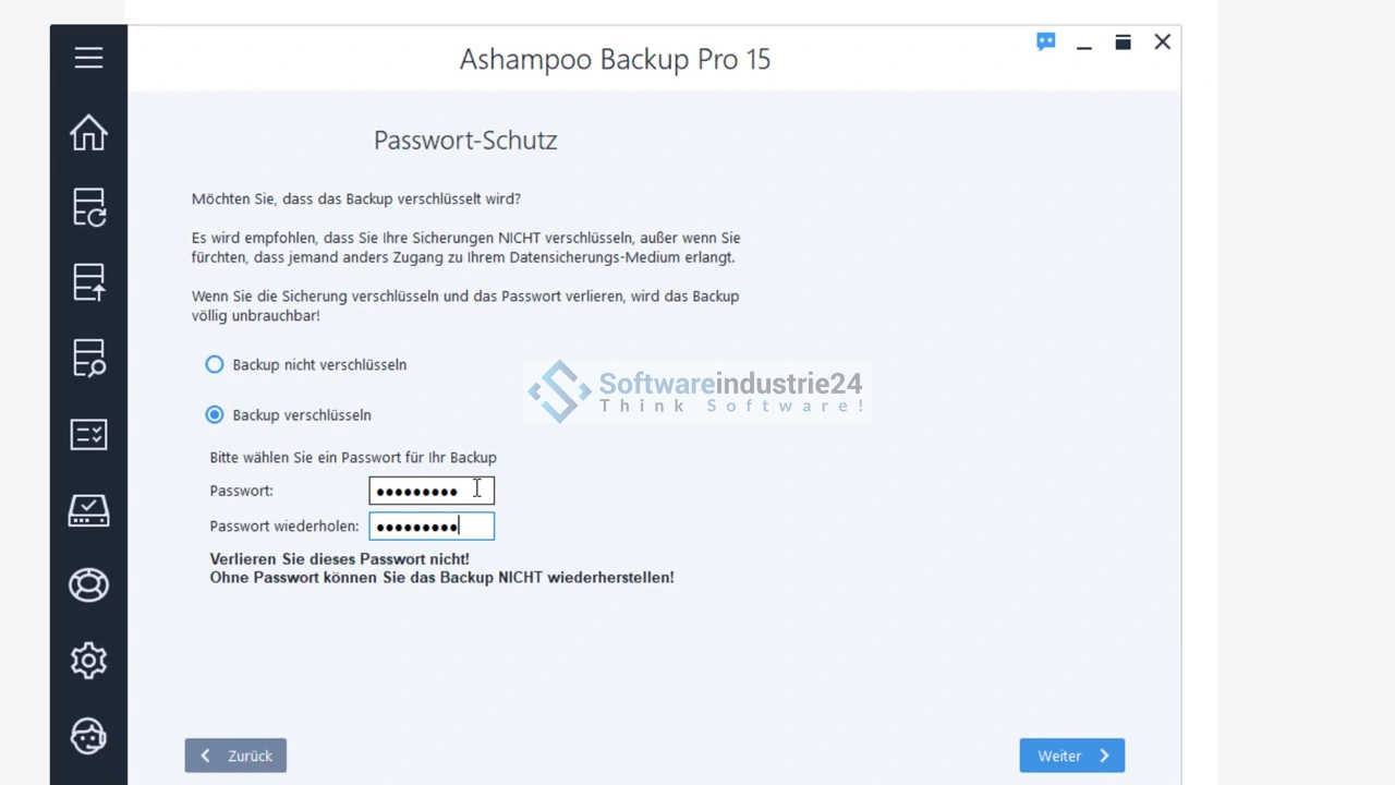 Die Wiederherstellung von Backups ist einfach und schnell. Sie können auswählen, welche Dateien oder Ordner wiederhergestellt werden sollen und auch das Zielverzeichnis festlegen. Zudem bietet die Software eine Boot-CD-Option, um das System im Falle eines Systemausfalls oder einer fehlerhaften Festplatte wiederherzustellen. Ashampoo Backup Pro 15 bietet auch Verschlüsselungsoptionen für Ihre Backups, um Ihre Daten vor unbefugtem Zugriff zu schützen. Darüber hinaus können Sie auch ein Passwort für den Zugriff auf die Software selbst festlegen.