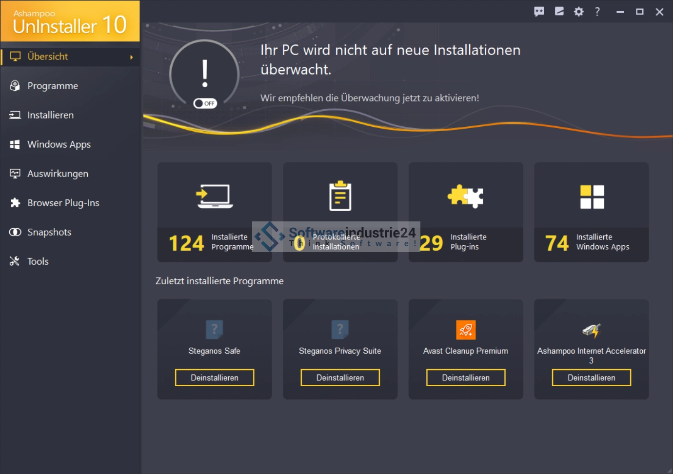 Ashampoo Uninstaller 10 verfügt auch über eine leistungsstarke Funktion zur Überwachung von Installationen, die es Ihnen ermöglicht, Änderungen an Ihrem System in Echtzeit zu verfolgen. Wenn Sie also ein neues Programm installieren, kann Ashampoo Uninstaller 10 diese Änderungen aufzeichnen und sicherstellen, dass alle Komponenten des Programms vollständig entfernt werden können, wenn Sie es später deinstallieren möchten. Darüber hinaus bietet Ashampoo Uninstaller 10 auch eine Reihe von Werkzeugen, um Überreste von deinstallierten Anwendungen und temporäre Dateien zu entfernen. Dies hilft Ihnen, Speicherplatz auf Ihrem Computer freizugeben und Ihr System aufgeräumt und effizient zu halten.
