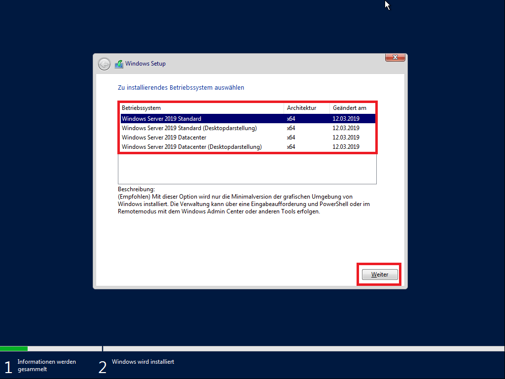 - Wählen Sie nun die Server-Version aus, welche Sie installieren möchten und klicken Sie auf „Weiter“.