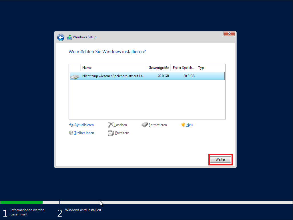 - Wählen Sie die passende Festplatte aus, auf der das Betriebssystem installiert werden soll und klicken Sie auf ,,Weiter“.