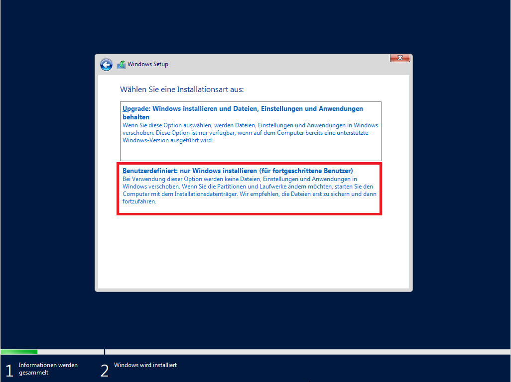 - Wählen Sie „Benutzerdefiniert: nur Windows installieren (für fortgeschrittene Benutzer)“ aus, um das Betriebssystem zu installieren.