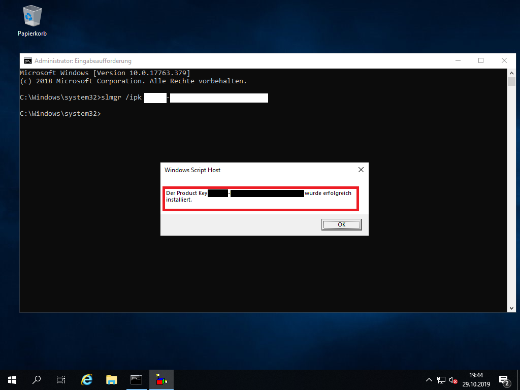 - Geben Sie in der Eingabeaufforderung ,,slmgr /ipk XXXX-XXXXX-XXXXX-XXXXX-XXXXX“ ein und drücken Sie auf „Enter“.