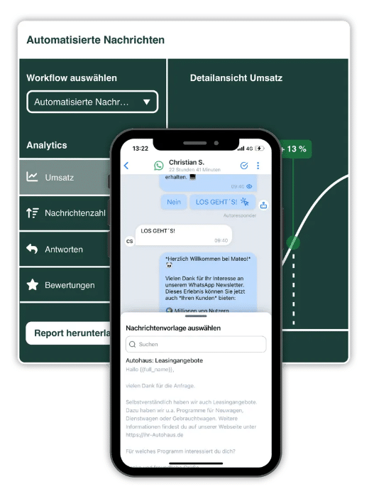 Ebenfalls sehr praktisch für Unternehmen die hellomateo nutzen, ist die Möglichkeit, automatisierte Nachrichten zu versenden. Unternehmen können so beispielsweise Bestellbestätigungen, Versandinformationen, Terminerinnerungen oder Bewertungsanfragen automatisch an Kunden senden.