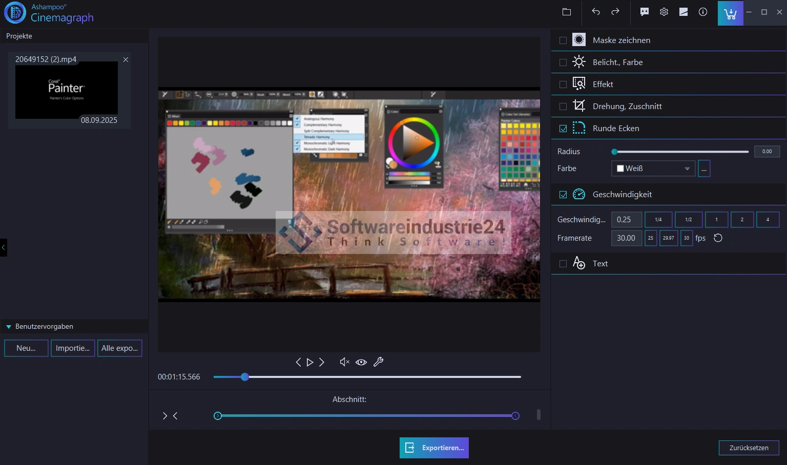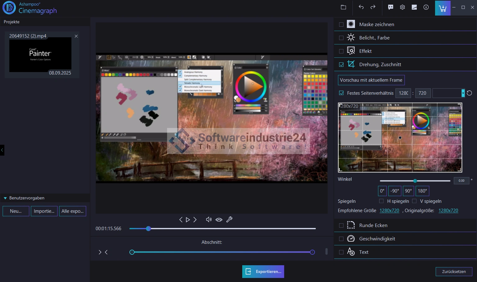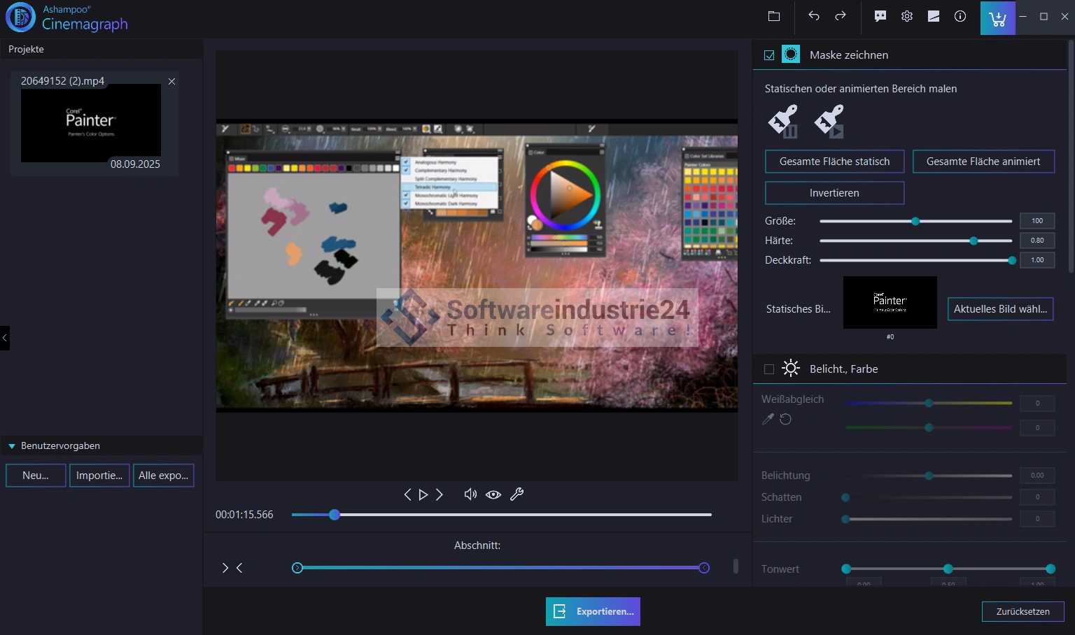 Ashampoo Cinemagraph is an innovative program for creating cinemagraphs, a special type of photo that features a moving area in an otherwise static image. With this software, you can quickly and easily create unique and impressive cinemagraphs without needing extensive knowledge of image editing. The program offers an intuitive user interface and is divided into three steps: Load your photo or video, select the area you want to animate, and export your finished cinemagraph file. Ashampoo Cinemagraph offers a wide range of tools and options to help you achieve the perfect effect for your image, including color adjustments, masking tools, and transitions. With Ashampoo Cinemagraph, you can export cinemagraphs in various formats and sizes, including GIF, MP4, and WMV. The cinemagraphs you create can be shared directly from the program or posted on social networks such as Facebook, Twitter, and Instagram.