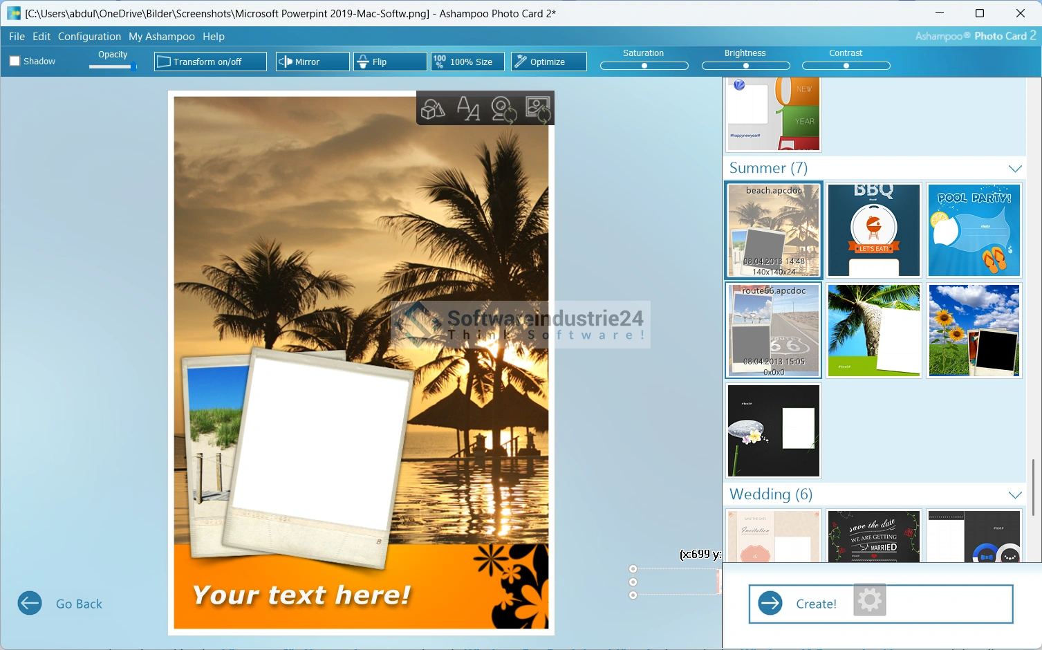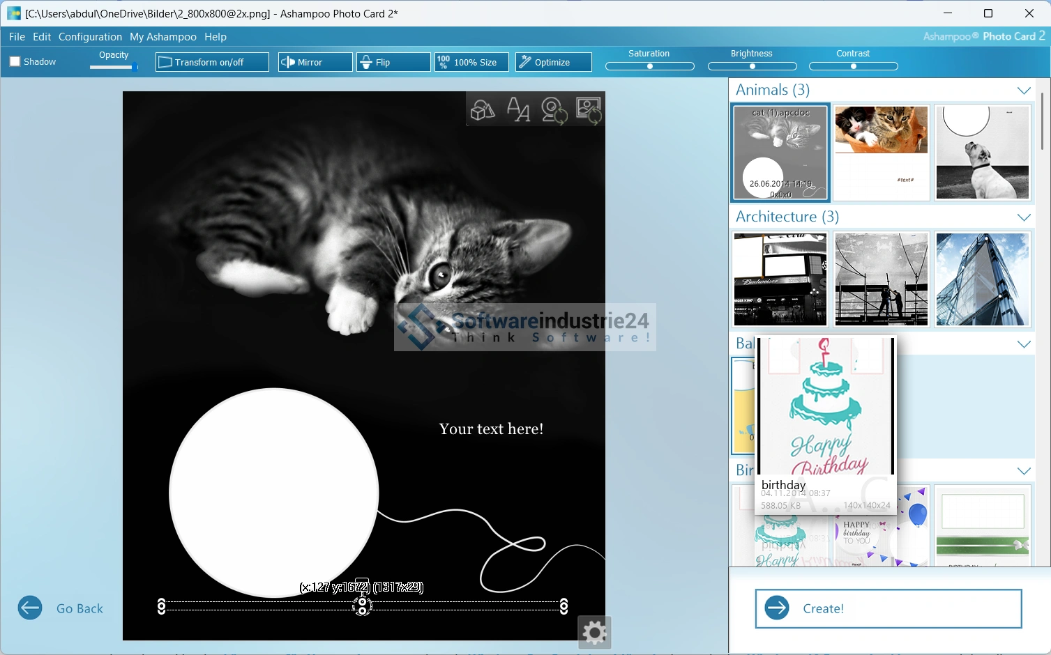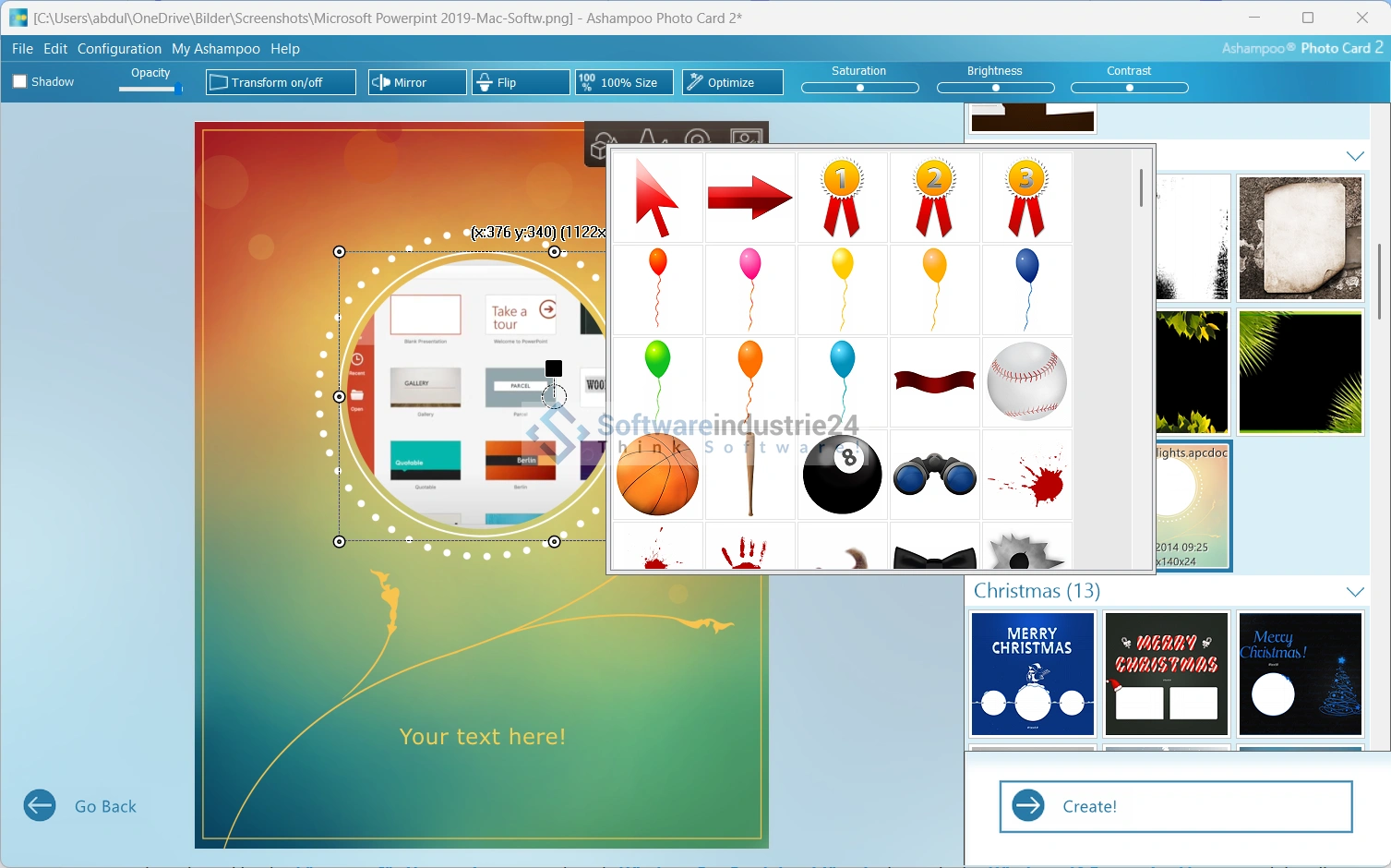 Ashampoo Photo Card 2 Complete Pack also allows you to personalize your cards with text and graphics . You can customize the font, color and size of the text and add more text elements to convey your message. In addition, various graphic objects such as arrows, balloons and hearts are available to give your cards a creative touch. The finished greeting cards can be sent directly by e-mail, printed out or saved on your computer. You have full control over the final product and can customize your cards to suit your individual needs. The Ashampoo Photo Card 2 Complete Pack is compatible with Windows 11, Windows 10, Windows 8/8.1 and Windows 7 operating systems. It supports a wide range of computers that support these operating systems . However, please note that systems with ARM processors are not supported.