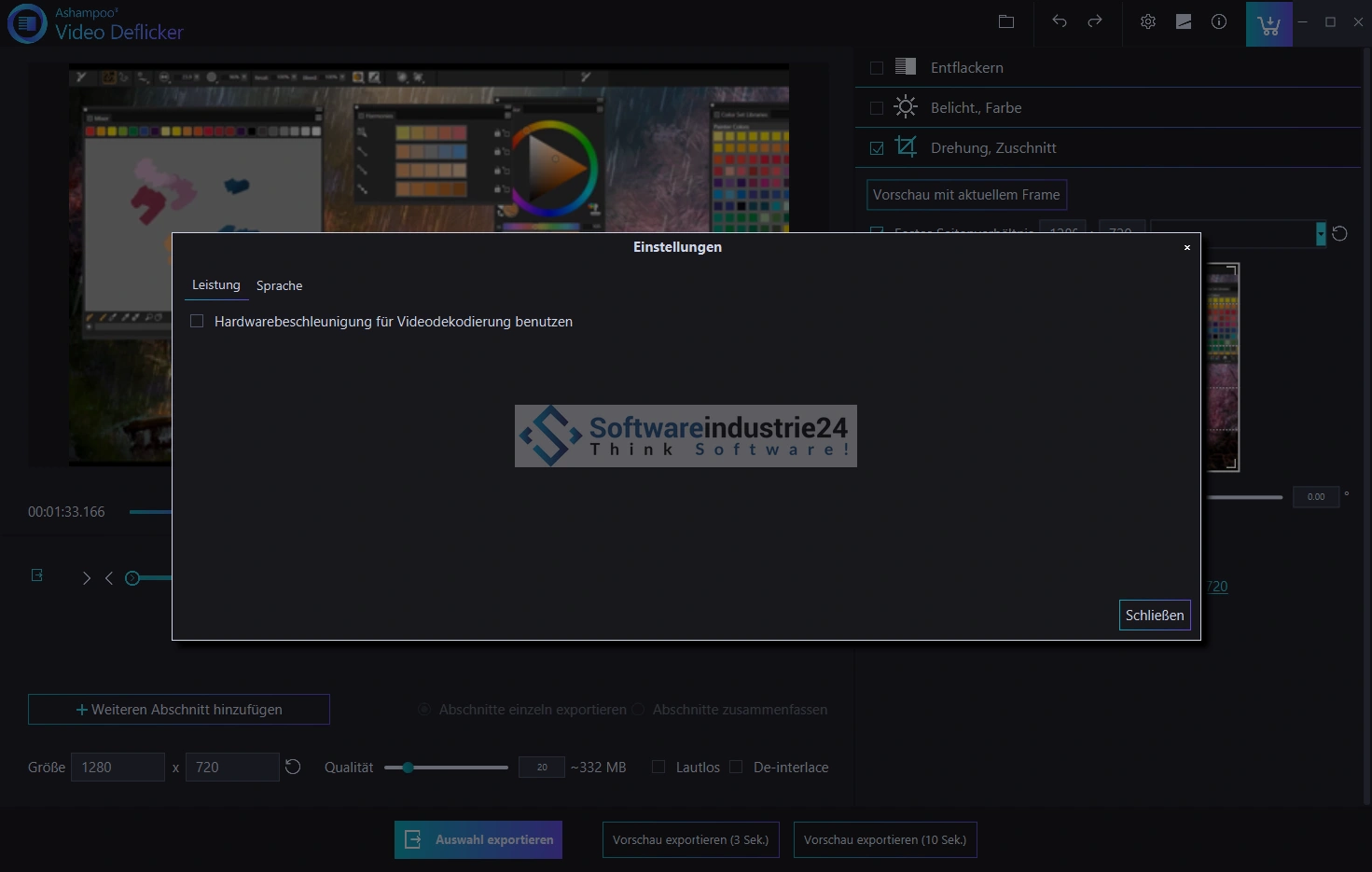 Ashampoo Video Deflicker is an advanced software designed specifically to reduce or eliminate flickering and flicker in videos. These unwanted effects can be caused by various factors such as different lighting, screen refresh rates or camera settings and can significantly impair video quality. With Ashampoo Video Deflicker, you can optimize your videos in just a few simple steps. The software analyzes the video material and automatically detects the flicker frequency. It then adjusts the brightness and contrast of each individual frame to reduce or eliminate flicker. One of the strengths of Ashampoo Video Deflicker is its user-friendliness. The intuitive user interface makes it easy for even beginners to use the program. You can easily import your videos, make the desired settings, and export the optimized video. In addition, Ashampoo Video Deflicker offers additional features to further improve the quality of your videos. You can adjust the image sharpness, make color corrections, and even add slow-motion effects. These advanced editing options allow you to customize your videos and achieve professional results.