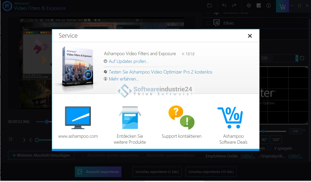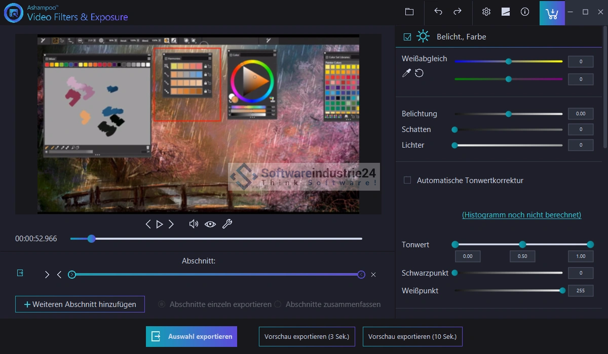 Ashampoo Video Filters and Exposures is a video editing program that offers a wide range of filters and effects to enhance your videos and give them a unique look. Here is a detailed product description: Ashampoo Video Filters and Exposures is a comprehensive software solution for editing and enhancing your videos. With a wide range of filters and effects, you can customize your recordings, correct colors, adjust exposure settings, and optimize the overall look of your videos. The software offers a user-friendly interface that allows you to easily import your videos, apply the desired filters, and view the results in real time. You can choose from a variety of preset filters that offer different styles and looks, or you can make your own adjustments to achieve the desired visual effect. With Ashampoo Video Filters and Exposures, you can adjust brightness, contrast, saturation, color temperature, and shadows, among other things. You can also make specific color corrections to optimize white balance or enhance or reduce certain hues. In addition, the software offers a range of creative effects such as vignetting, vintage looks, film grain effects, and much more to give your videos a unique aesthetic touch.