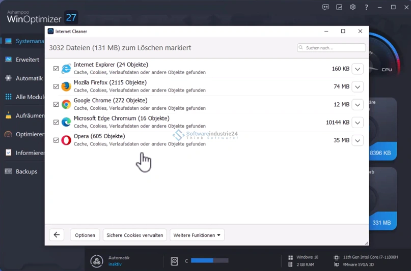 - Internet Cleaner: Removes all surfing traces, such as cookies, cache files and browser histories. This not only speeds up your browser, but also protects your privacy.