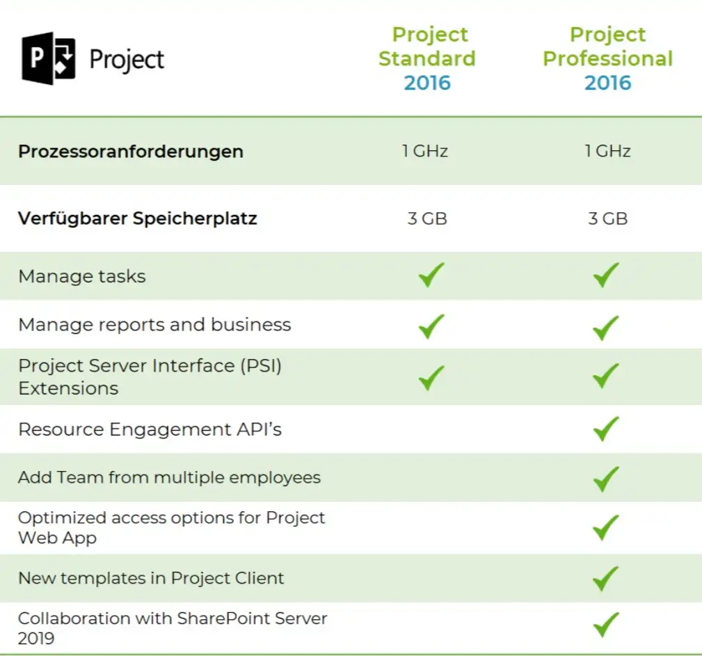 Die Mindestanforderungen für die Installation von Microsoft Project 2016 Standard auf einem PC mit Windows-Betriebssystem sind:
