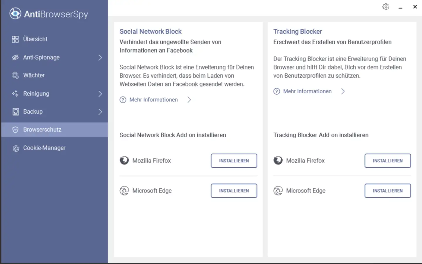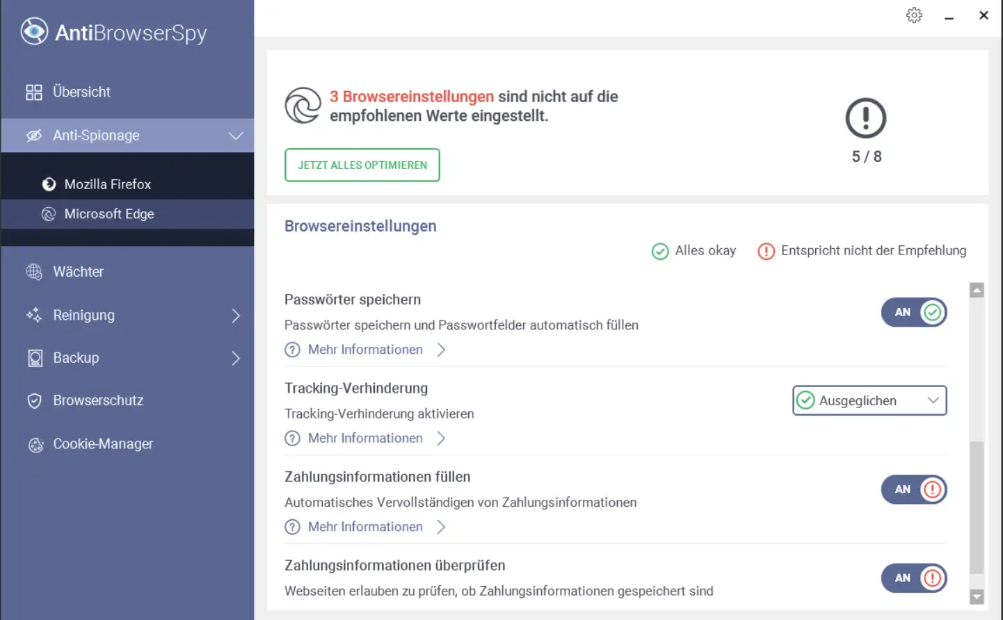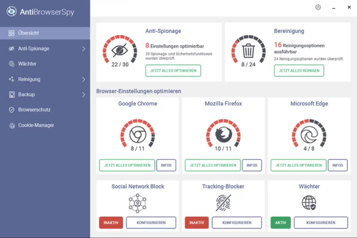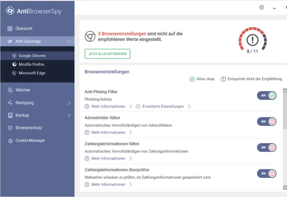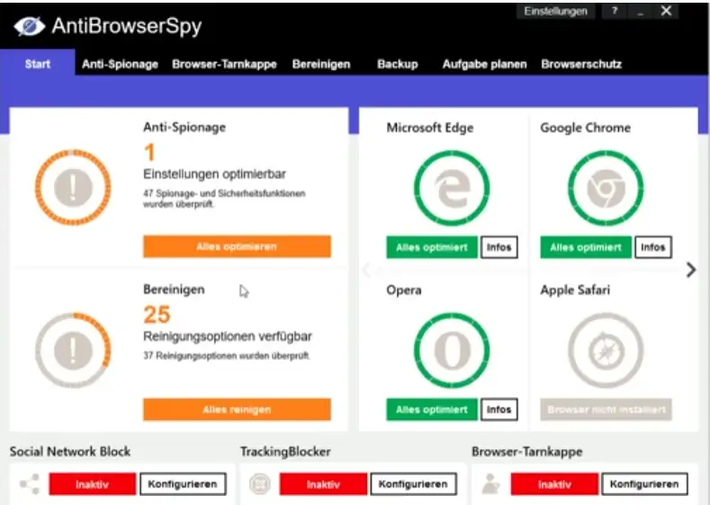 Niezależnie od tego, czy korzystasz z Chrome, Firefox, Edge czy jakiejkolwiek innej przeglądarki, Abelssoft AntiBrowserSpy oferuje spersonalizowaną ochronę dla Twojej ulubionej przeglądarki. Możesz łatwo dostosować ustawienia prywatności dla każdej przeglądarki i zapewnić ochronę swojej prywatności w każdym scenariuszu online.