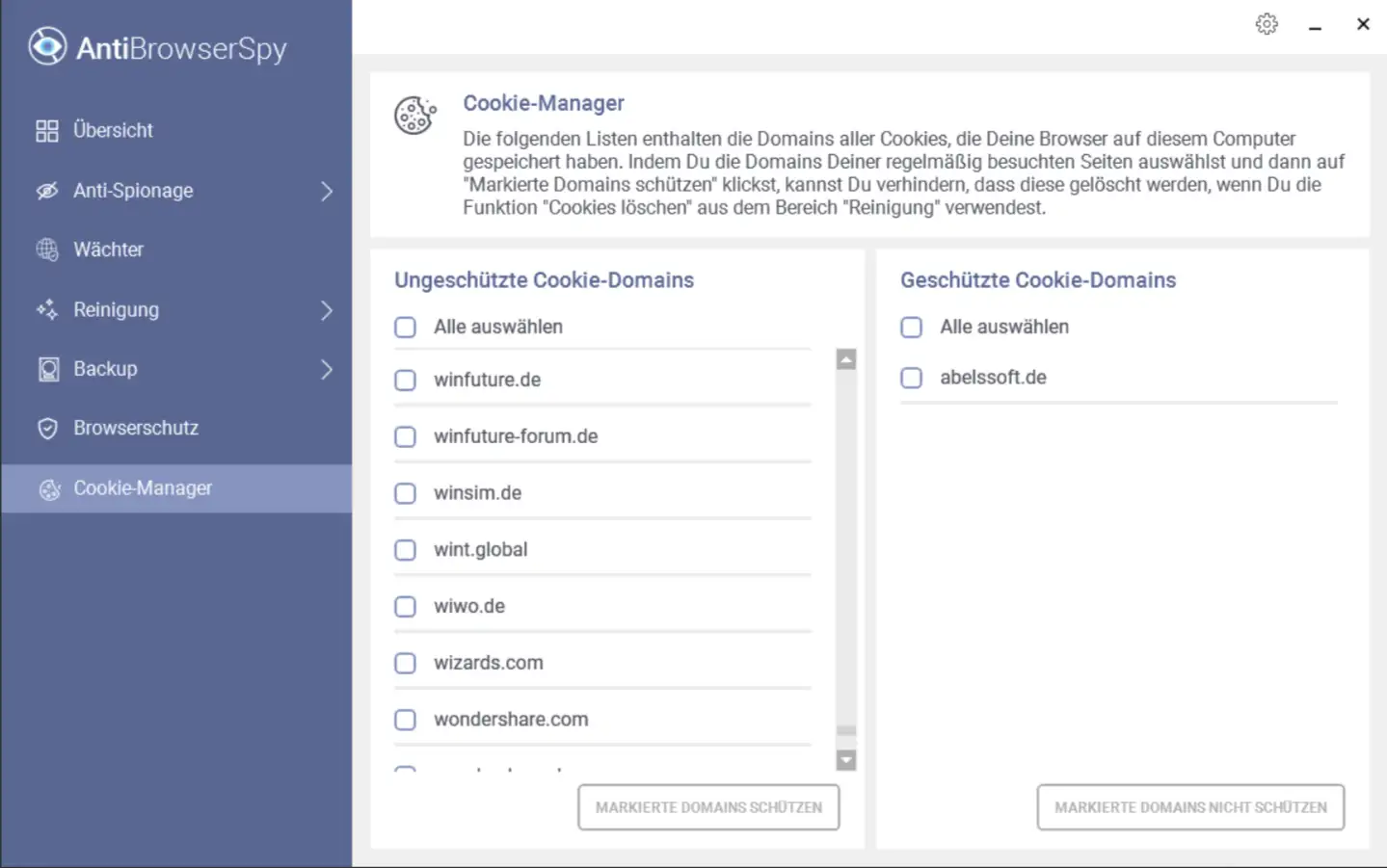 Abelssoft AntiBrowserSpy skutecznie blokuje śledzące pliki cookie, zapobiega gromadzeniu danych osobowych przez osoby trzecie i chroni przed ukierunkowanymi reklamami. Dzięki jego inteligentnym funkcjom możesz bezpiecznie surfować po Internecie bez obawy o ujawnienie poufnych informacji.